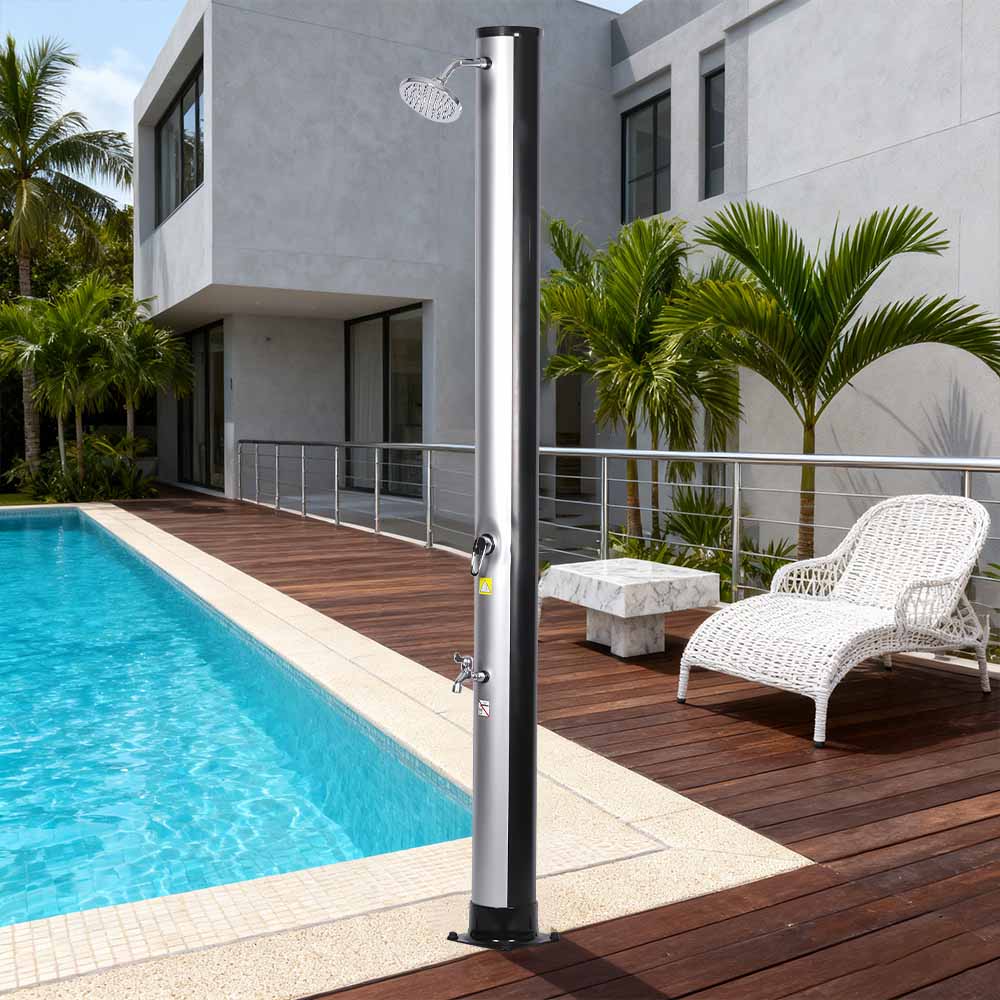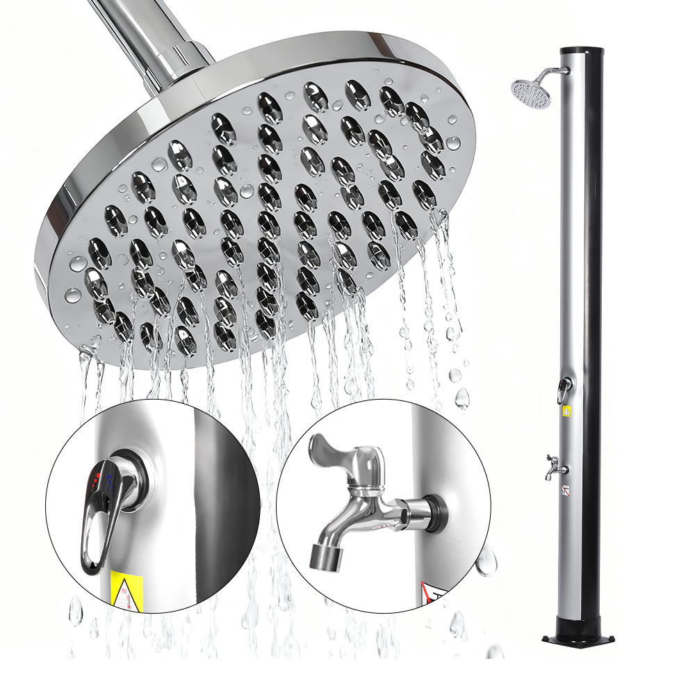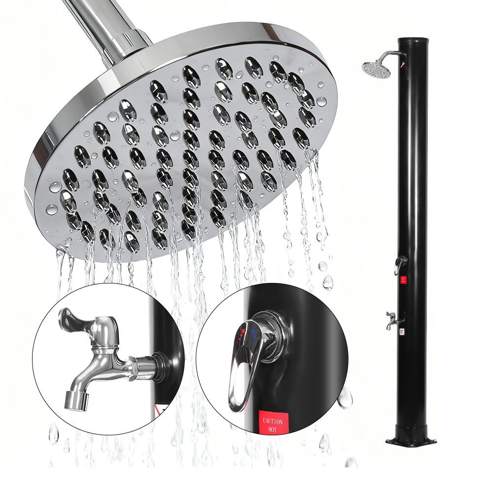 この LY35L06 ポータブル屋外環境に優しいソーラー シャワーのゆったりとしたサイズのシャワー パイプは、太陽の力を利用して水を最大 60°C まで加熱し、電気を必要とせず、屋外入浴に環境に優しいソリューションを提供します。標準的な庭のホースを接続してシャワーパイプを満たすだけで、家族全員が庭、プールサイド、またはキャンプ旅行で元気の出るシャワーを楽しむことができます。実用的な内蔵金属トレイにより、石鹸やシャンプーなどのシャワー必需品を手の届くところに保管でき、底部の排水スロットにより水が溜まるのを防ぎ、清潔で快適な体験を保証します。一体型ボールジョイントに取り付けられた 360 度回転可能なレイン シャワー ヘッドにより、水の流れの方向を簡単に調整でき、楽しい清涼感を生み出すことができます。また、追加の足洗い用蛇口により、素早くリフレッシュするのに便利です。利便性を考慮して設計されたこのシャワーは、オフシーズンや旅行時の持ち運びのためにコンパクトで省スペースに保管できるように簡単に分解できます。